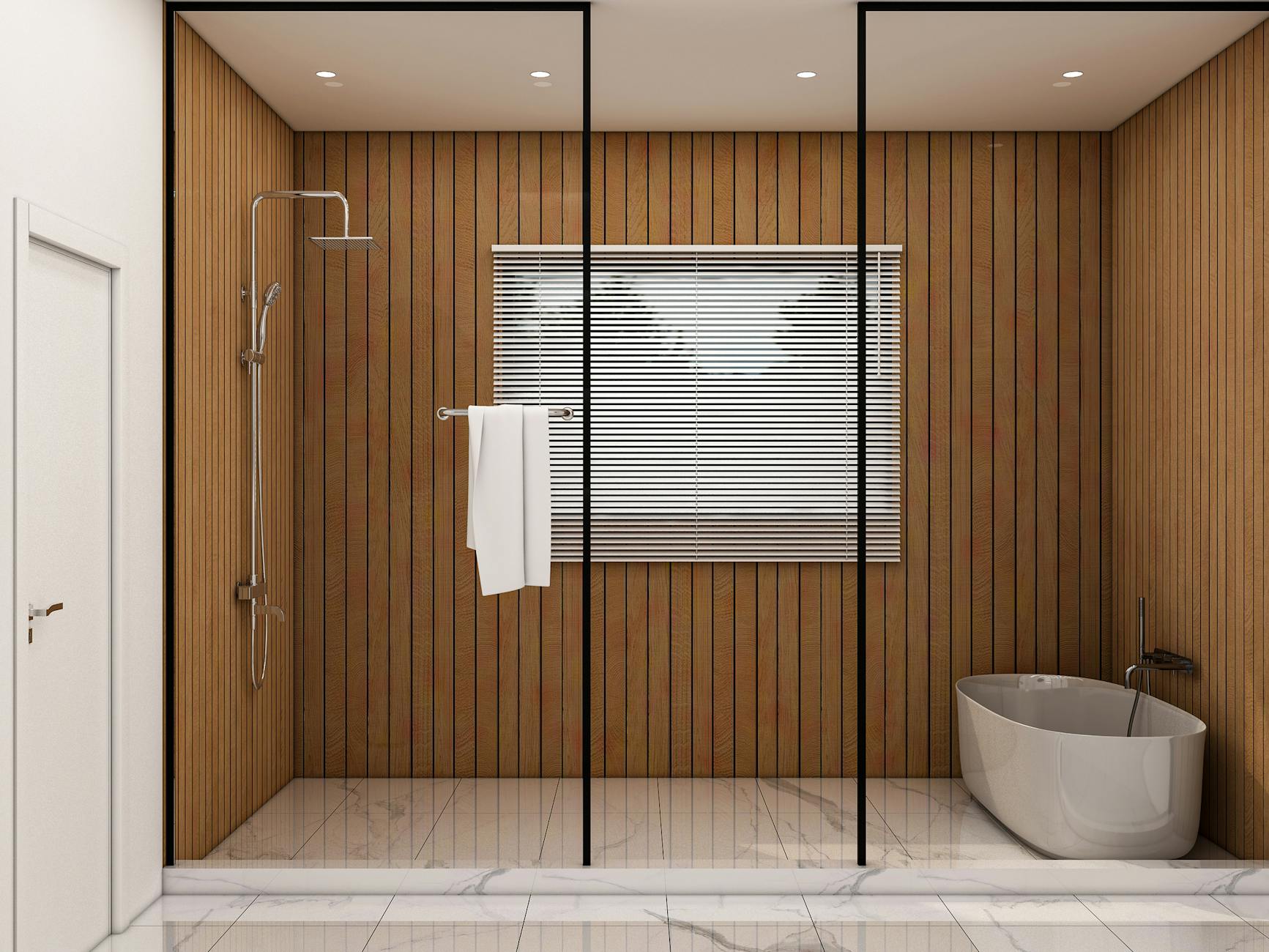 • Japandi Schmale, tiefe Schlitze, dunkles Thermoholz, klare Raster